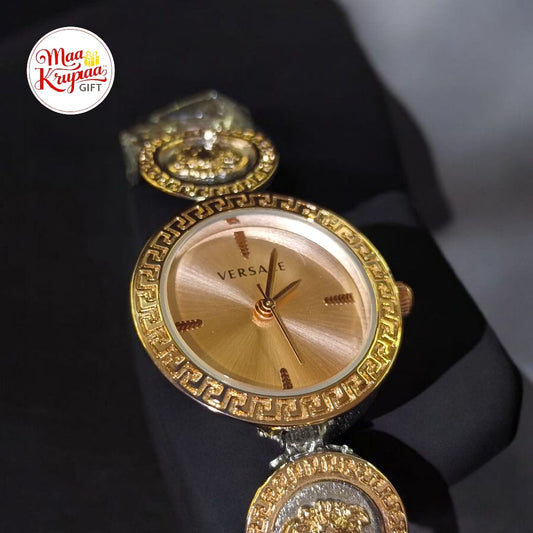 PREMIUM VERSACE LOGO PRINTED BELT WITH ROSE GOLD COLOUR DIAL VERSACE LADIES WATCH 687