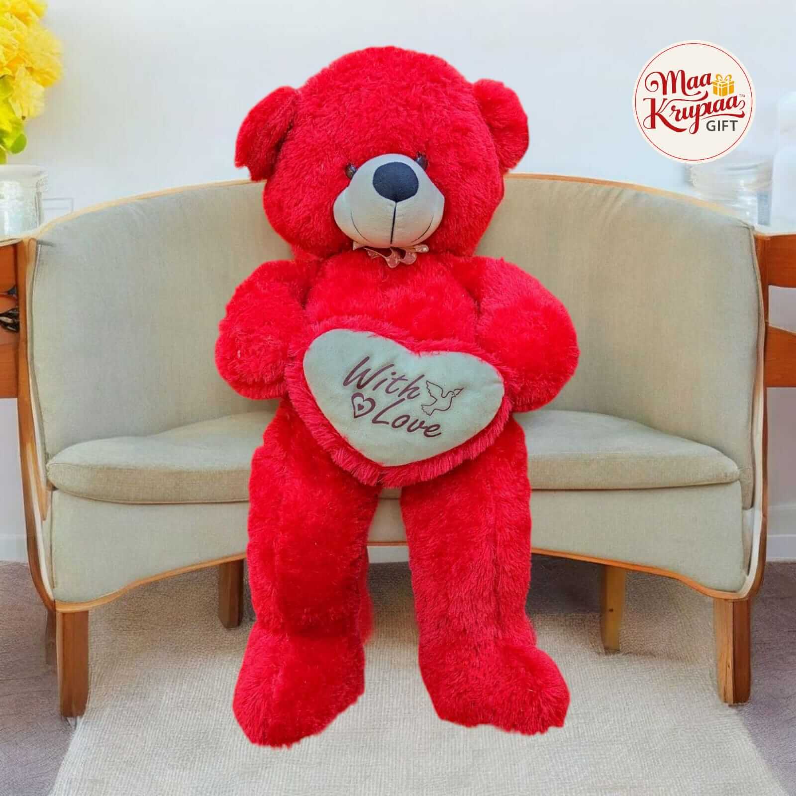 A VIBRANT RED PLUSH TEDDY BEAR HOLDING A HEART PILLOW EMBROIDERED WITH THE MESSAGE "WITH LOVE" AND DECORATED WITH A CUTE DOVE AND HEART SYMBOLS. THIS ADORABLE BEAR HAS A CREAM FACE, BIG ROUND NOSE, AND A MATCHING NECK RIBBON, MAKING IT A SWEET GIFT FOR ANY OCCASION.