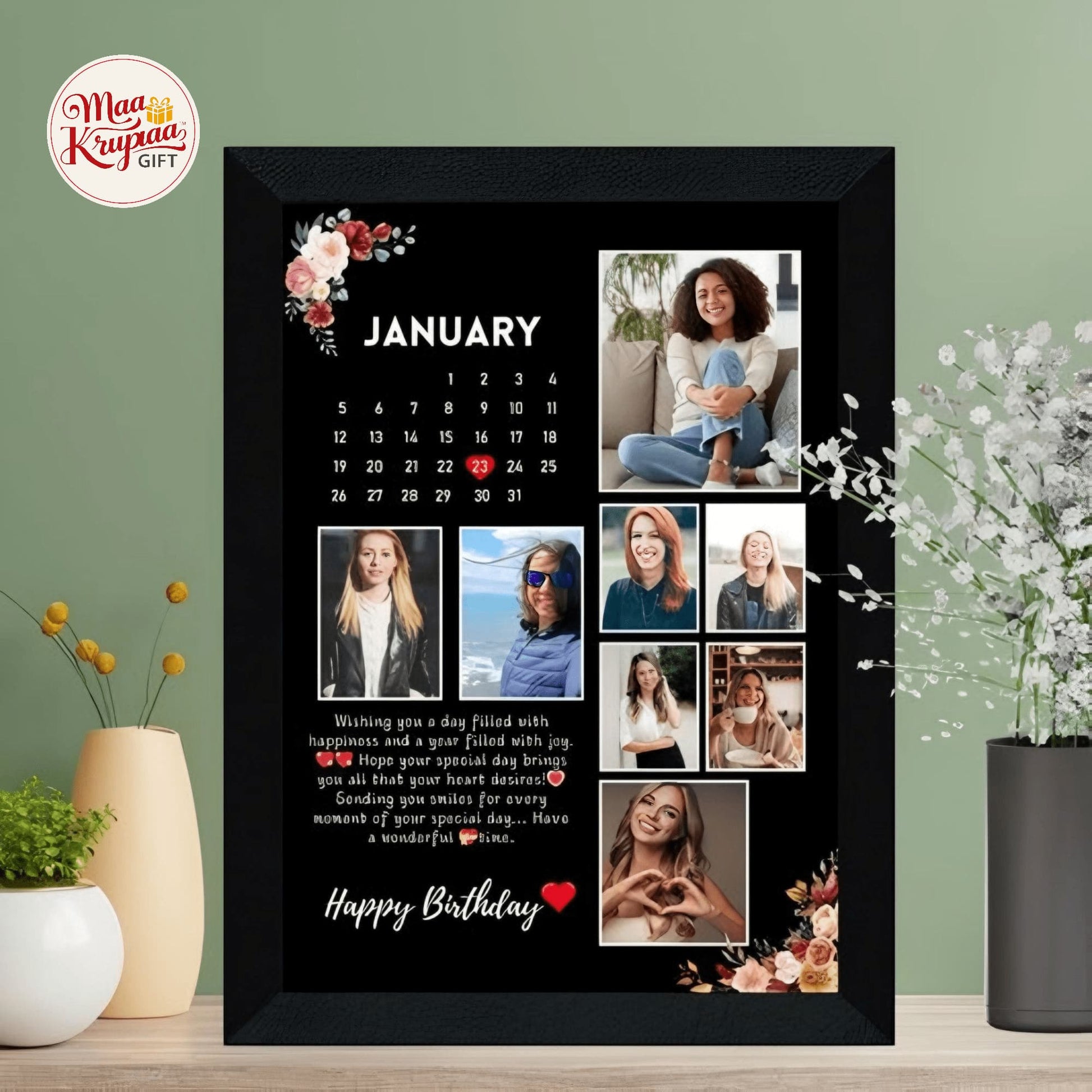 A STYLISH BLACK FRAME FEATURING A PERSONALIZED MONTHLY CALENDAR, HIGHLIGHTING A BIRTHDAY DATE WITH MULTIPLE PHOTOS AND A SWEET BIRTHDAY MESSAGE. PERFECTLY DESIGNED FOR GIFTING TO LOVED ONES.
