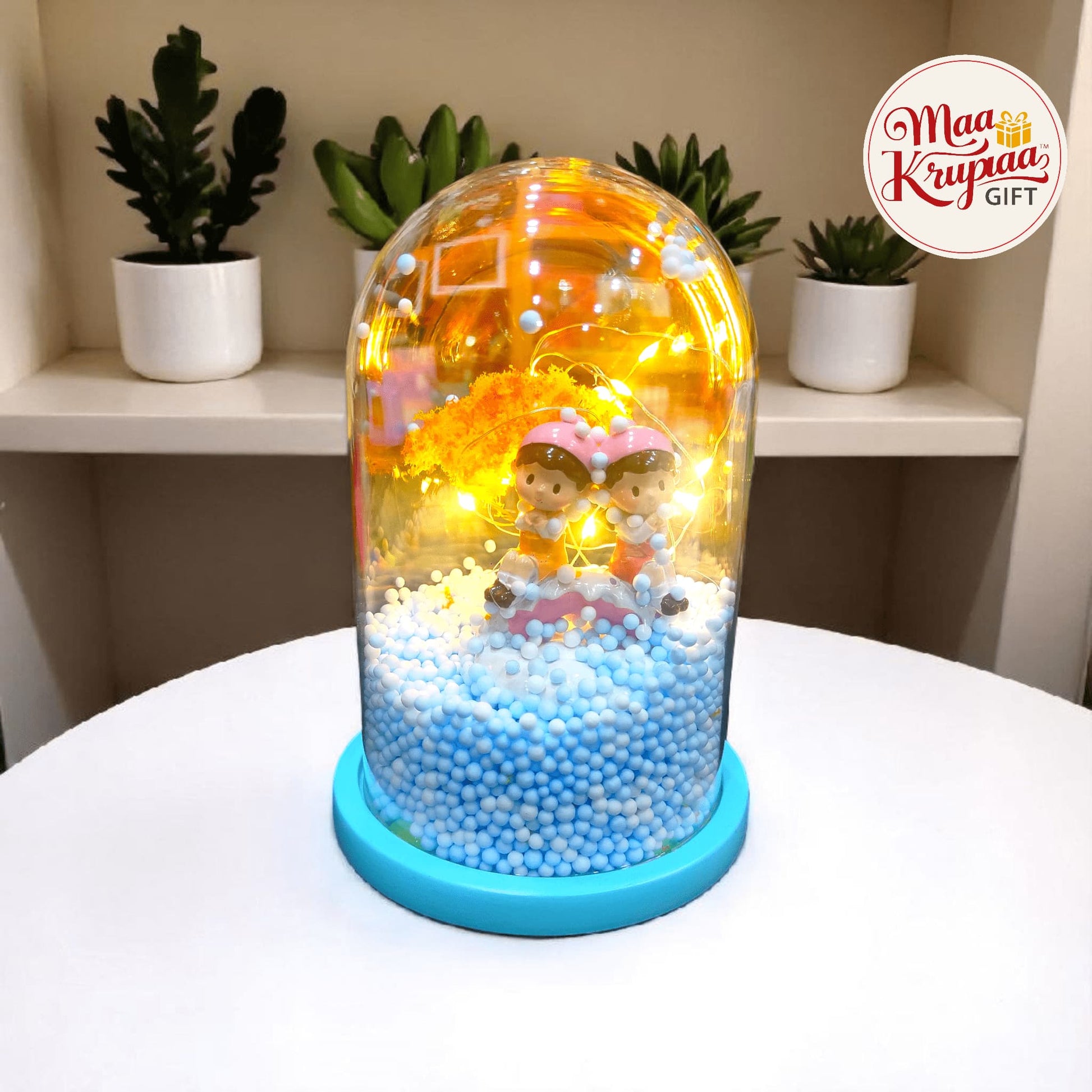 A BEAUTIFULLY DESIGNED SHOWPIECE FEATURING AN ADORABLE COUPLE SITTING ON A SWING, ENCASED UNDER A CLEAR DOME. DECORATED WITH A BOUQUET-LIKE TREE, FOAM BEADS, AND WARM LED STRING LIGHTS, THIS PIECE CREATES A MAGICAL, ROMANTIC AMBIANCE. THE BUILT-IN MUSICAL FEATURE ADDS A TOUCH OF ENCHANTMENT, MAKING IT A PERFECT GIFT FOR LOVED ONES.