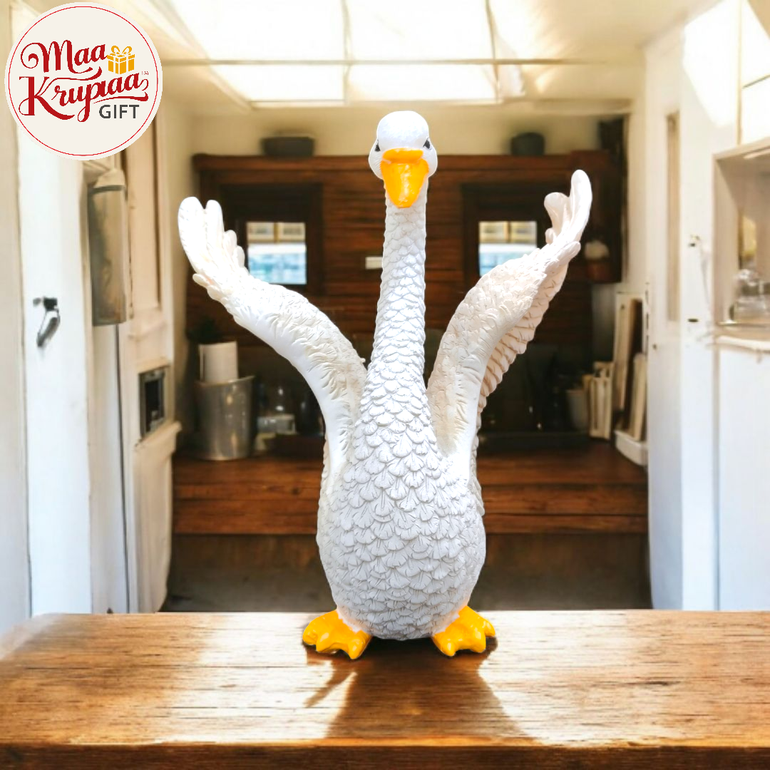 This is a handmade, white resin swan figurine with its wings spread. It has a realistic design with intricate details and is hand-painted with realistic colors. The figurine is designed to be a decorative showpiece for both indoor and outdoor use.