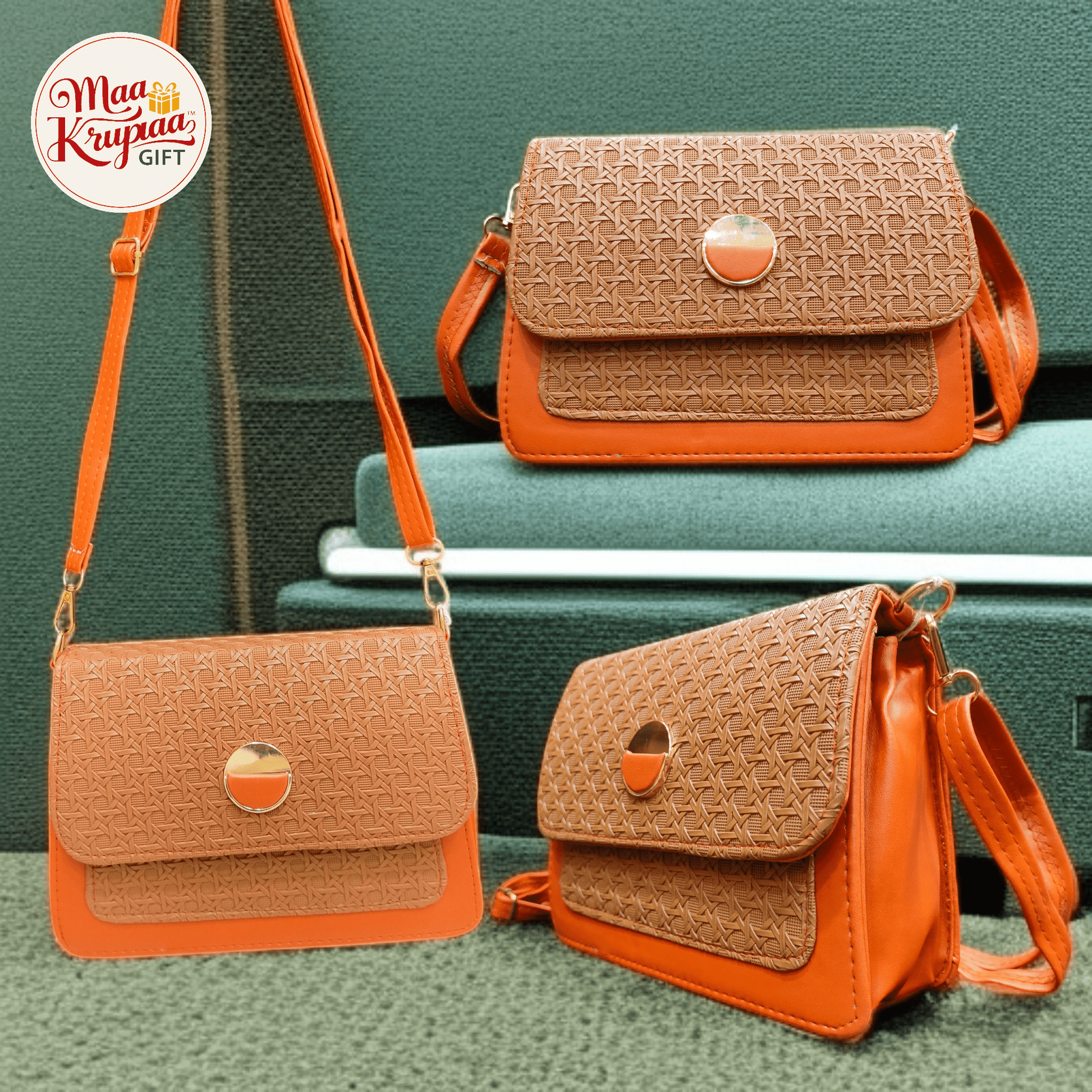 ADD A TOUCH OF FLAIR TO YOUR OUTFIT WITH THIS MODERN ORANGE-BROWN CROSSBODY SLING BAG. FEATURING AN ELEGANT TEXTURED FLAP AND POLISHED METALLIC CLASP, THIS BAG IS PERFECT FOR CASUAL OUTINGS, SHOPPING TRIPS, OR SOCIAL GATHERINGS.