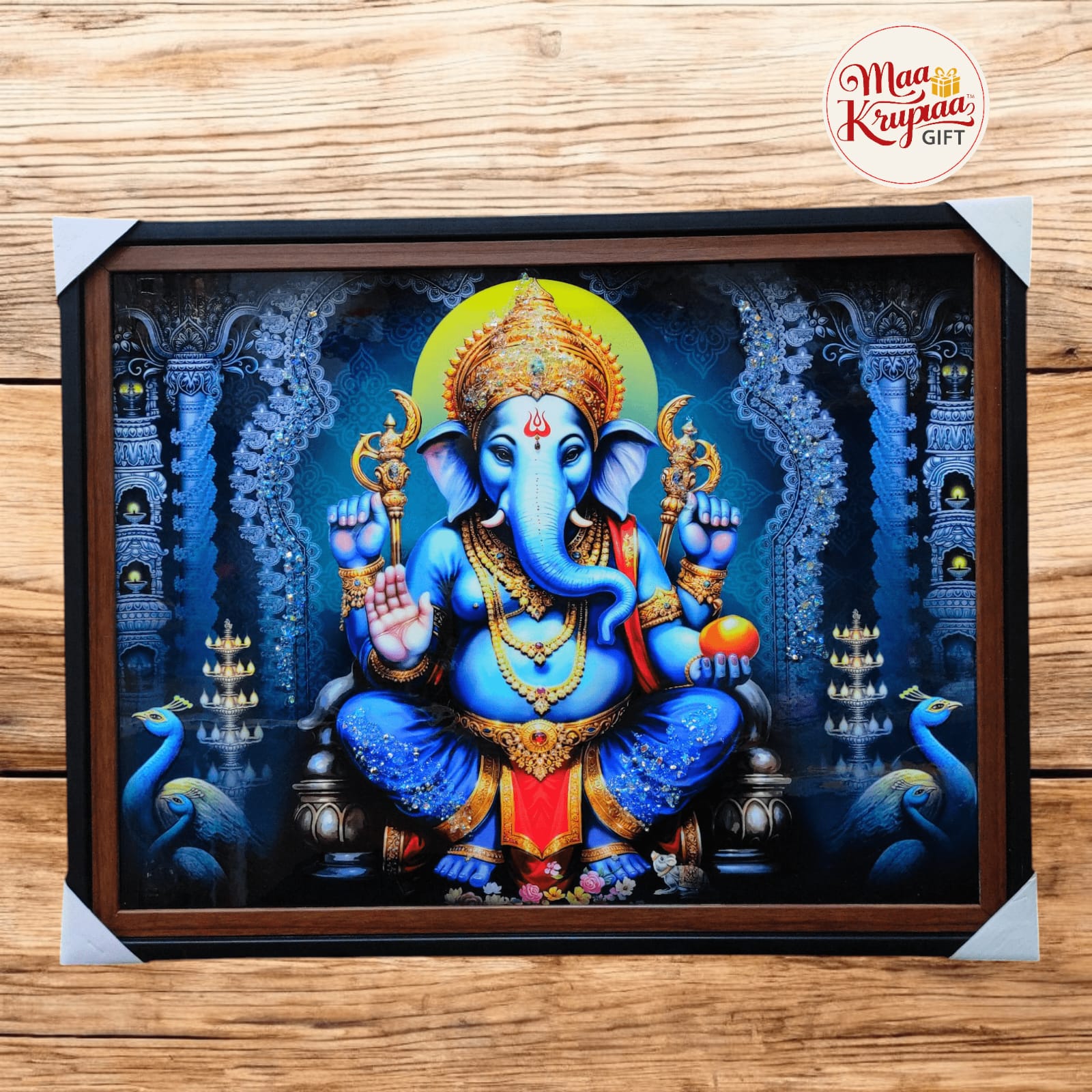 AN ENCHANTING IMAGE OF LORD GANESHA IN BLUE TONES, SEATED IN A TRADITIONAL TEMPLE SETTING. THIS WALL FRAME FEATURES INTRICATE ARCHITECTURAL DETAILS, PEACOCKS, AND A GOLDEN HALO TO SYMBOLIZE DIVINE ENERGY AND BLESSINGS.