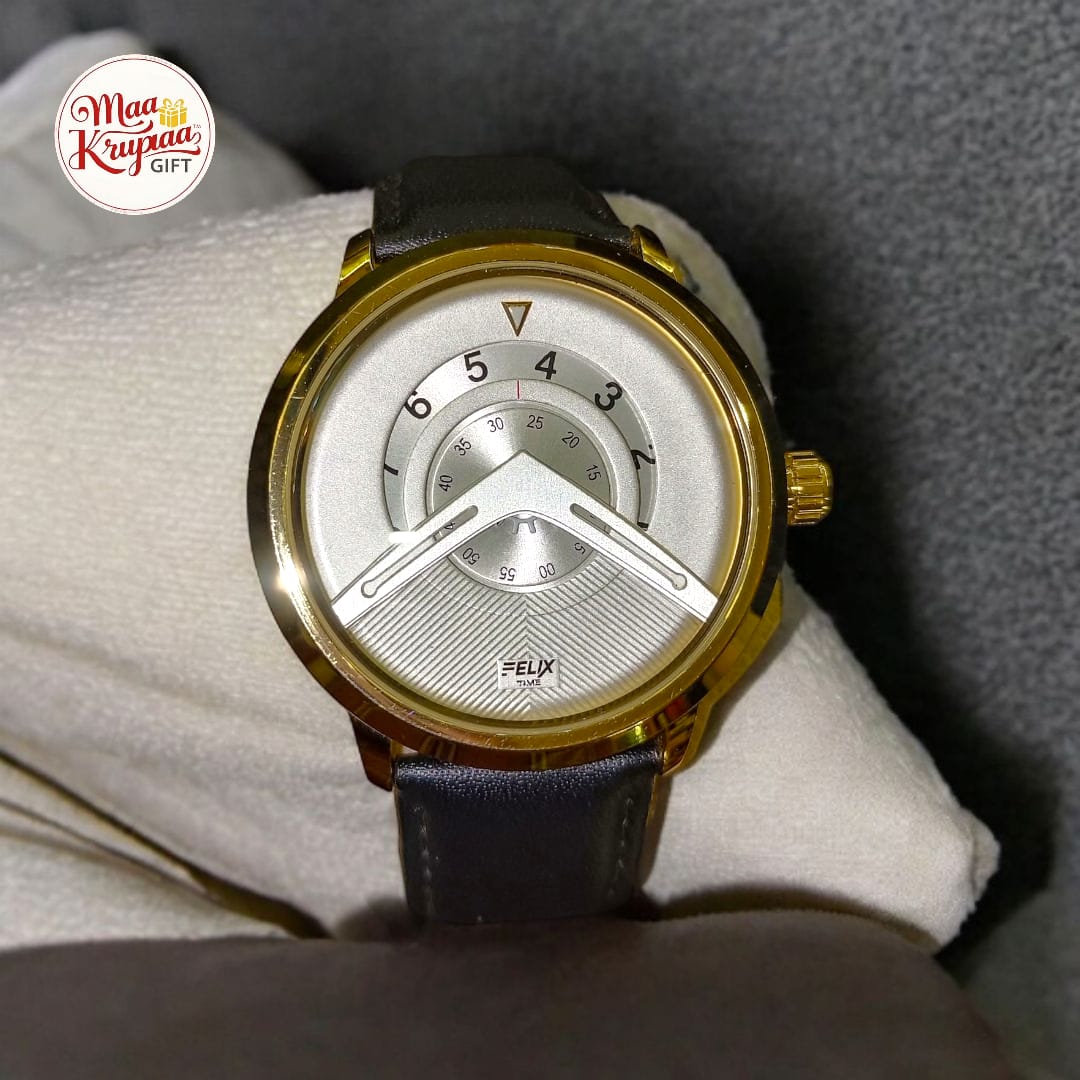 Break free from tradition with the Felix Orbit Retrograde, a bold timepiece that reimagines how time is told. Featuring a semi-retrograde display with a rotating arc for the hour and a unique lower semi-circle for the minutes, this watch isn’t just about telling time — it's about showcasing innovation. With a sleek gold-tone bezel, a modern silver dial, and a classic black leather strap, this watch is perfect for those who dare to be different and appreciate futuristic aesthetics.