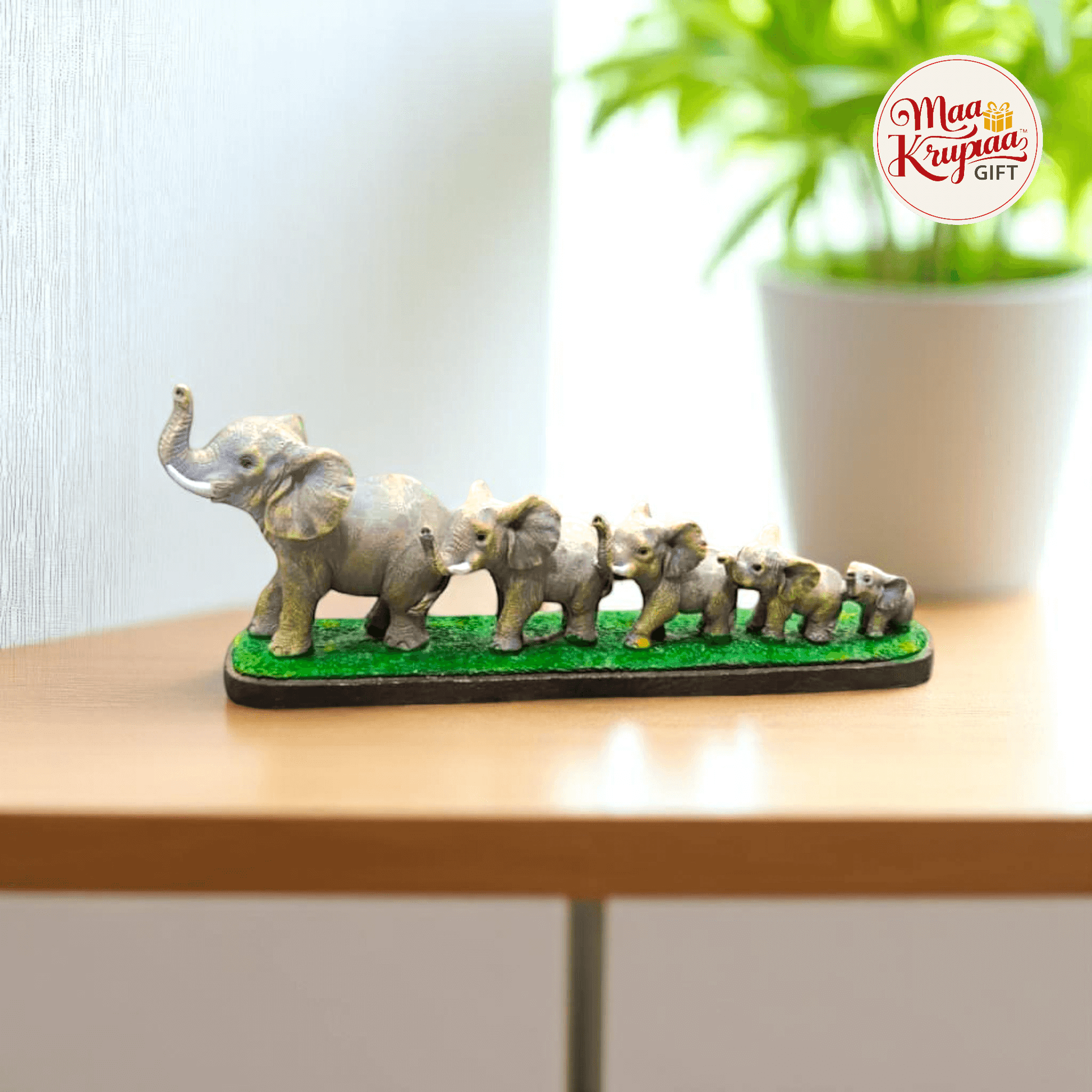 A BEAUTIFULLY CRAFTED STATUE DEPICTING A MOTHER ELEPHANT LEADING HER FIVE BABY ELEPHANTS IN A LINE. THE STATUE FEATURES REALISTIC DETAILS AND IS SET ON A GREEN BASE TO RESEMBLE GRASS. IT IS IDEAL FOR HOME DECOR OR AS A SYMBOL OF FAMILY BOND AND TOGETHERNESS.