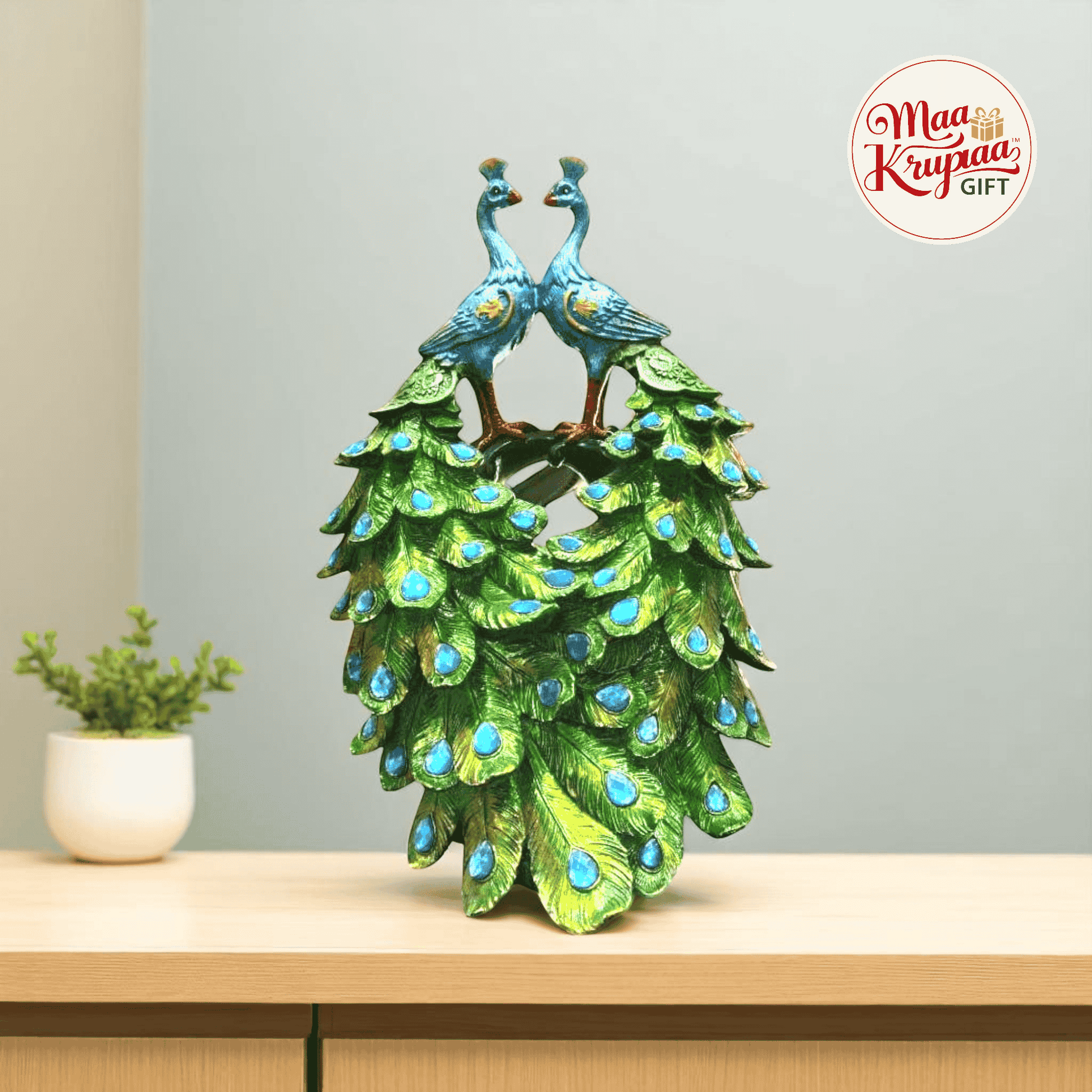 A BEAUTIFULLY CRAFTED TWIN PEACOCK SHOWPIECE FEATURING TWO MAJESTIC BLUE PEACOCKS PERCHED TOGETHER WITH THEIR VIBRANT GREEN FEATHERS SPREAD IN A SYMMETRICAL CASCADE. THE DETAILED FEATHER DESIGN IS ACCENTUATED WITH BRIGHT BLUE DROPLET PATTERNS, ADDING ELEGANCE AND COLOR TO ANY INTERIOR SPACE.