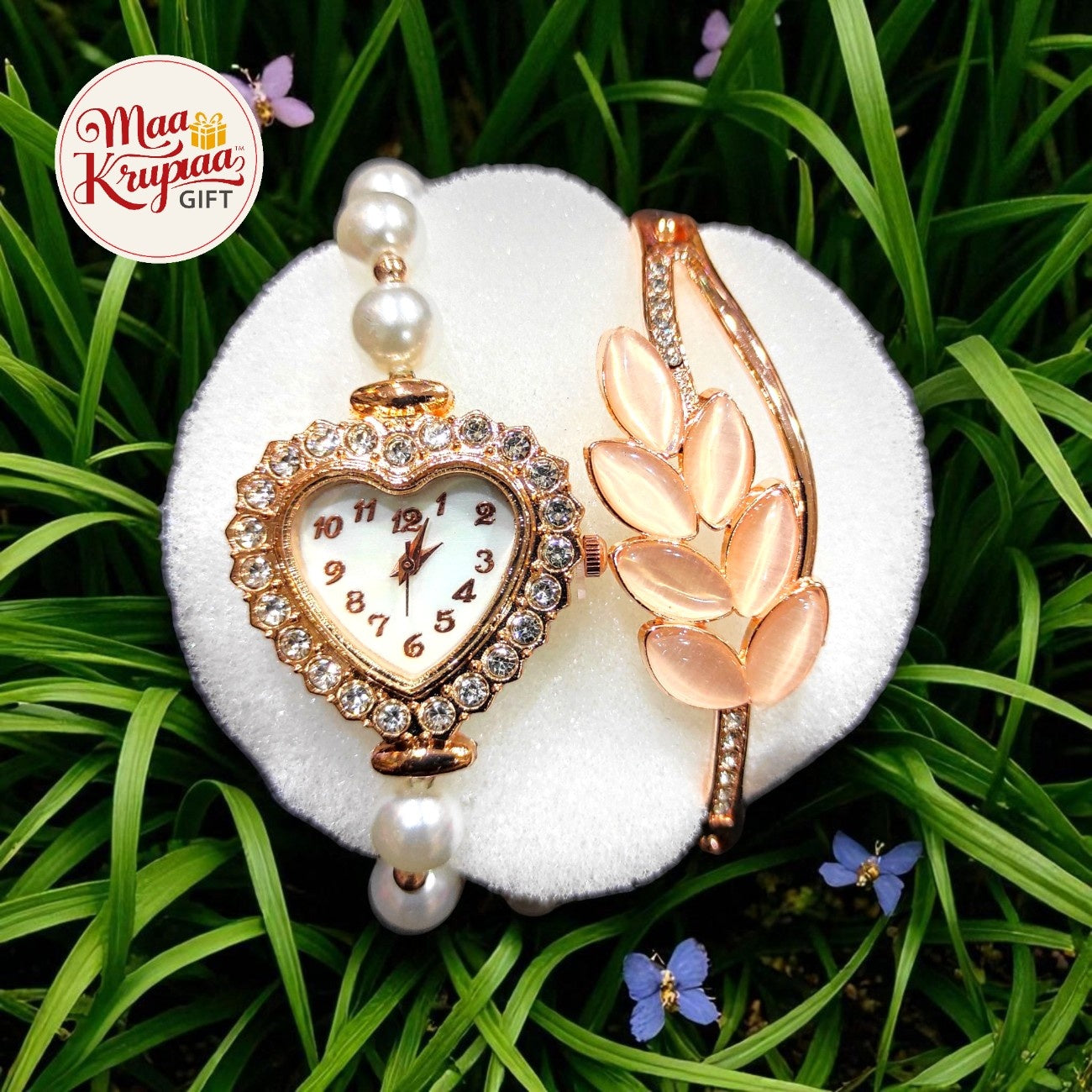 A PREMIUM LUXURY WATCH COMBINED WITH AN ELEGANT DESIGNER BRACELET, PERFECTLY CRAFTED FOR SPECIAL OCCASIONS AND DAILY STYLE. THE WATCH FEATURES A GOLDEN DIAL SURROUNDED BY SPARKLING STONES AND CLASSIC PEARL BEADS, PROVIDING A TIMELESS AND SOPHISTICATED LOOK. THE MATCHING BRACELET SHOWCASES A CURVED DESIGN STUDDED WITH ELEGANT STONES, MAKING IT A PERFECT COMBINATION OF ELEGANCE AND FUNCTIONALITY. IDEAL FOR GIFTING OR PERSONAL USE TO ELEVATE YOUR STYLE STATEMENT.