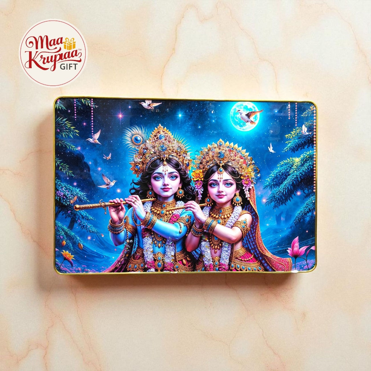 A DIVINE AND ELEGANT WALL FRAME FEATURING LORD KRISHNA AND RADHA IN BEAUTIFUL ARTISTIC DESIGNS. EACH FRAME IS CRAFTED WITH VIBRANT COLORS, INTRICATE DETAILS, AND A BLISSFUL BACKDROP THAT SYMBOLIZES ETERNAL LOVE, DEVOTION, AND TOGETHERNESS. PERFECT FOR HOME DECOR, PUJA ROOMS, AND GIFTING PURPOSES, THESE FRAMES ADD A TOUCH OF DIVINITY AND PEACE TO ANY SPACE.