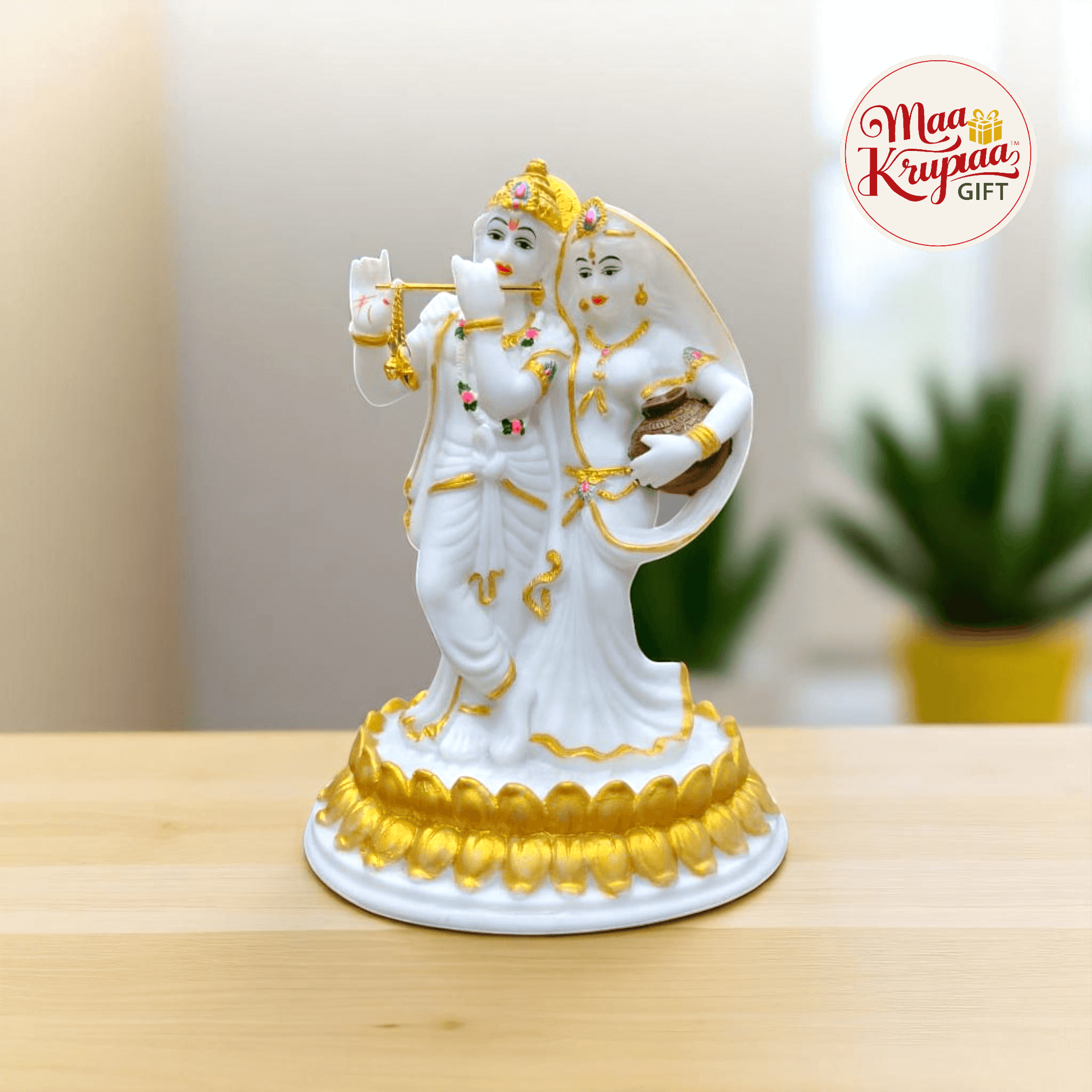 A BEAUTIFULLY CRAFTED WHITE AND GOLDEN STATUE DEPICTING LORD KRISHNA PLAYING THE FLUTE WITH RADHA STANDING BESIDE HIM HOLDING A POT. THE STATUE IS PLACED ON A DECORATIVE BASE WITH GOLDEN LOTUS PETALS.