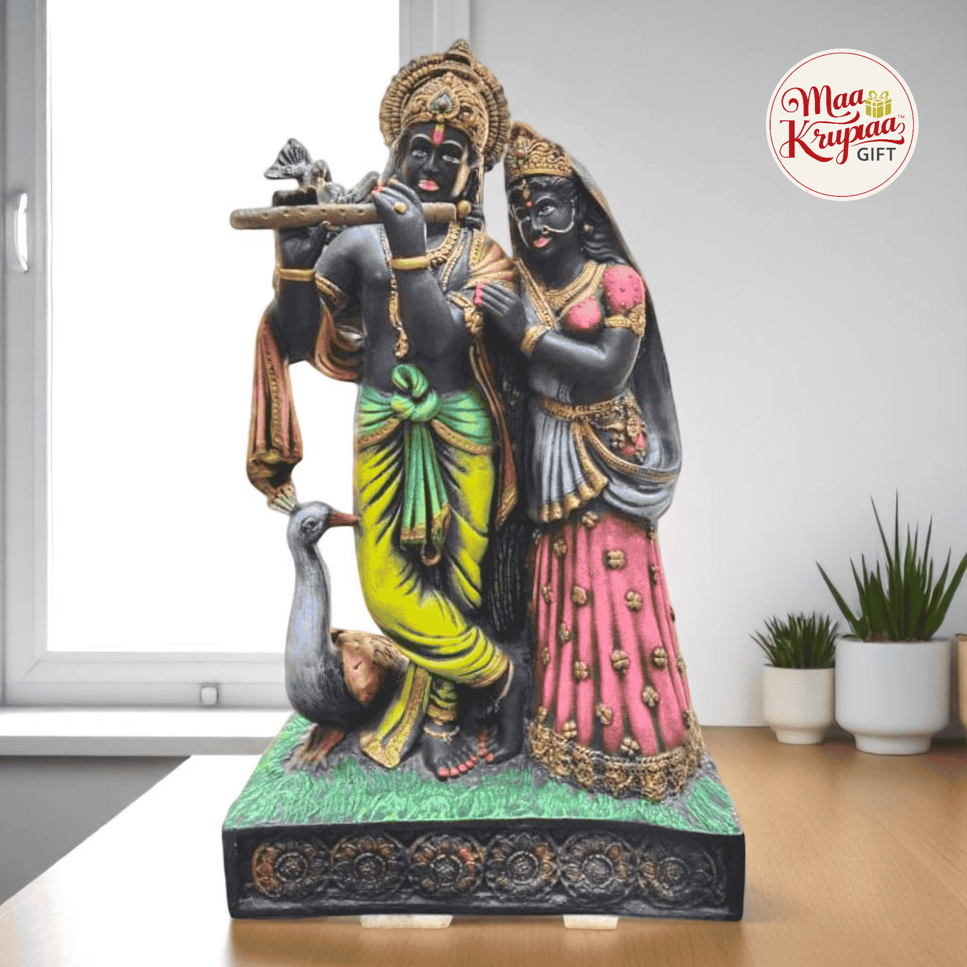 EXQUISITELY DESIGNED RADHA KRISHNA IDOL DEPICTING LORD KRISHNA PLAYING THE FLUTE WITH RADHA BY HIS SIDE. THE STATUE SHOWCASES TRADITIONAL ATTIRE, DETAILED JEWELLERY, AND A PEACOCK AT THEIR FEET, SYMBOLIZING DIVINE LOVE AND HARMONY. IDEAL FOR HOME DÉCOR, MANDIR, OR GIFTING.