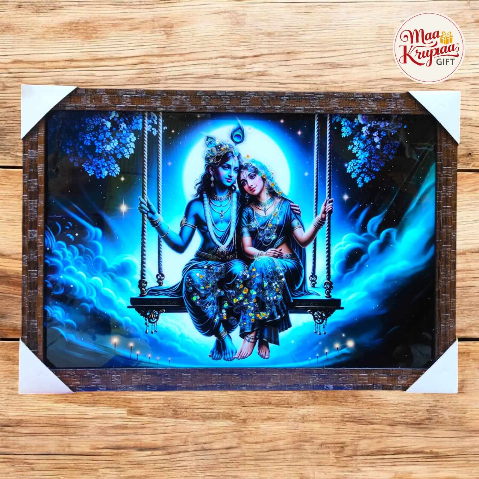 A BEAUTIFUL WALL FRAME DEPICTING RADHA AND KRISHNA SITTING TOGETHER ON A SWING UNDER THE FULL MOON. THIS SCENE CAPTURES THEIR DIVINE LOVE IN A TRANQUIL, STARRY NIGHT SETTING.