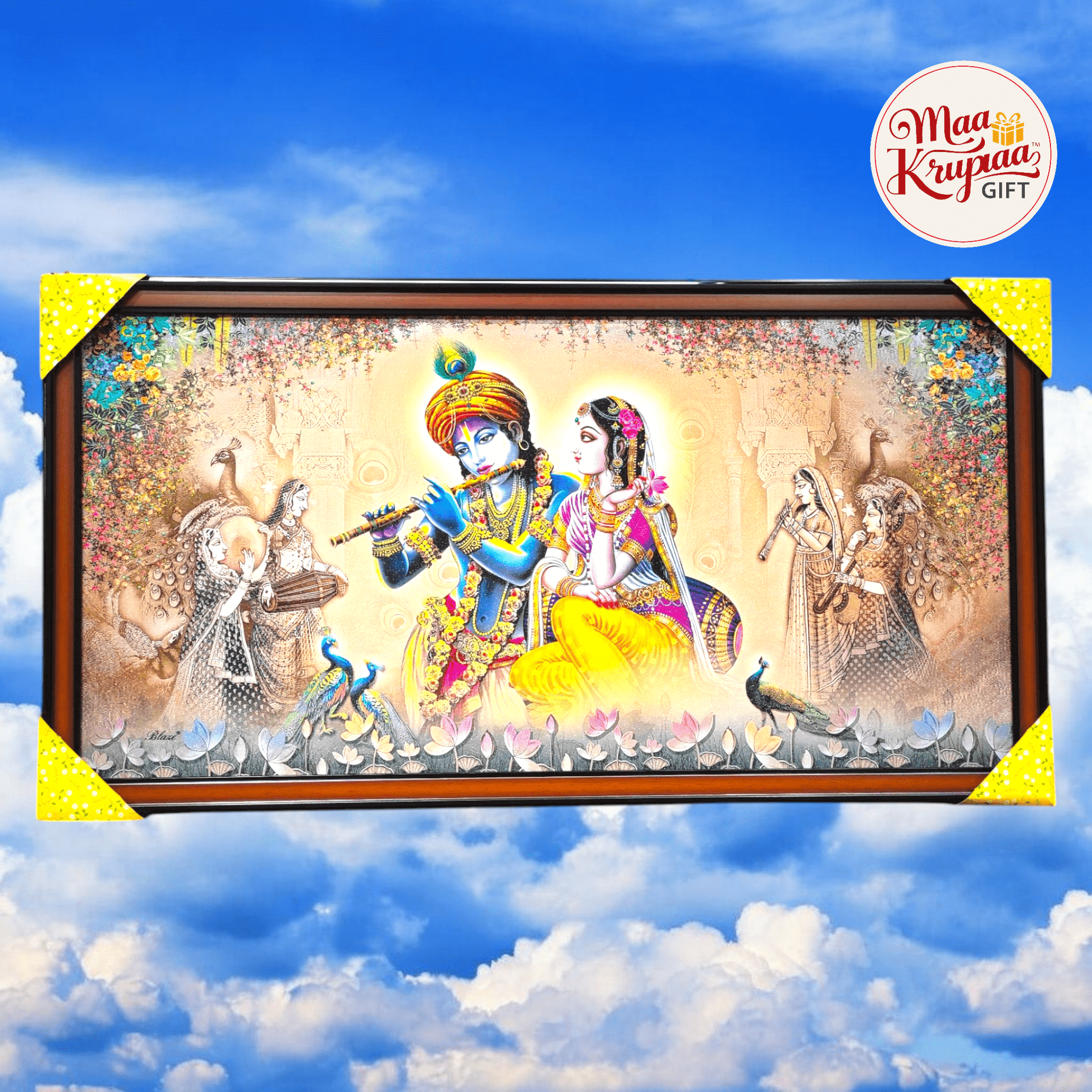 DIVINE ARTISTIC WALL FRAME FEATURING LORD KRISHNA PLAYING THE FLUTE BESIDE RADHA, SURROUNDED BY PEACOCKS AND GOPIS IN A VIBRANT MYTHOLOGICAL SETTING.