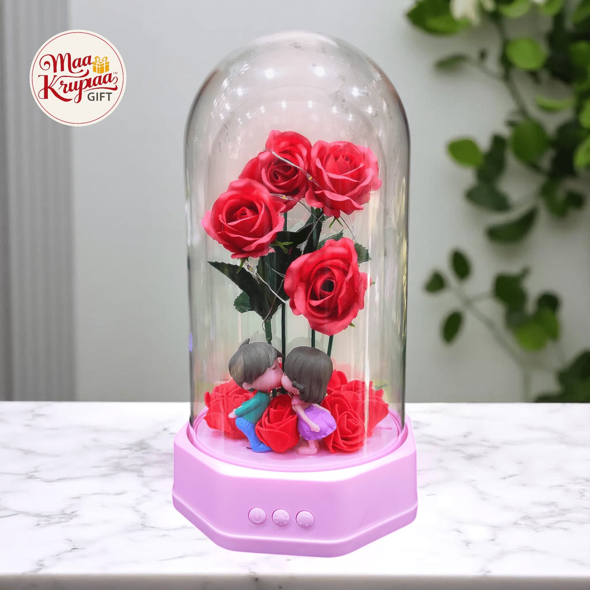 A HEARTWARMING DECOR PIECE FEATURING A COUPLE KISSING UNDER A BOUQUET OF VIBRANT RED ROSES INSIDE A HIGH-QUALITY GLASS DOME. SET ON A STYLISH PINK BASE, THIS PIECE COMBINES BEAUTY WITH FUNCTION, OFFERING LED LIGHTS, BUILT-IN MUSIC, AND BLUETOOTH CONNECTIVITY. PERFECT FOR GIFTING ON VALENTINE'S DAY, ANNIVERSARIES, OR TO EXPRESS LOVE ON ANY OCCASION.