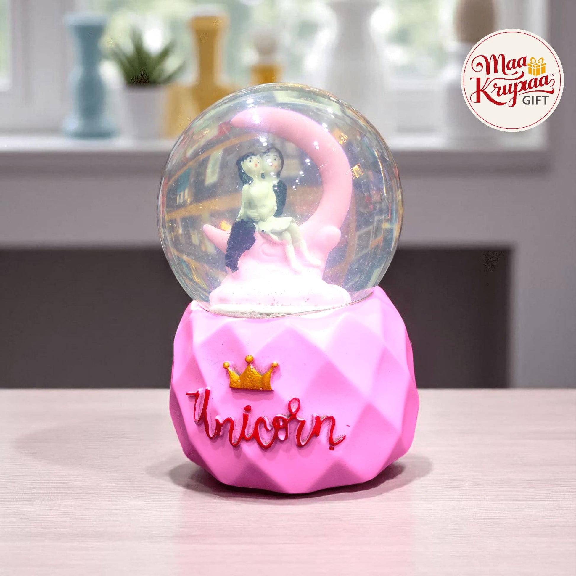 A CUTE AND DREAMY SNOW GLOBE FEATURING A COUPLE SITTING TOGETHER ON A PINK MOON, WITH A DIAMOND-PATTERNED PINK BASE EMBLAZONED WITH THE WORD “UNICORN” AND A GOLDEN CROWN. PERFECT FOR ROMANTIC GIFTS, BIRTHDAYS, OR ROOM DECOR.
