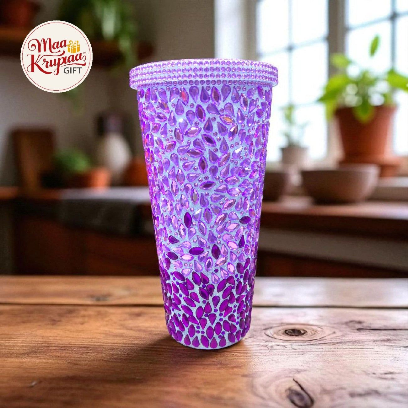 A luxurious, handcrafted tumbler embedded with shimmering crystal-like stones in varying shades of purple. Designed to add elegance and sparkle to your drinkware collection.