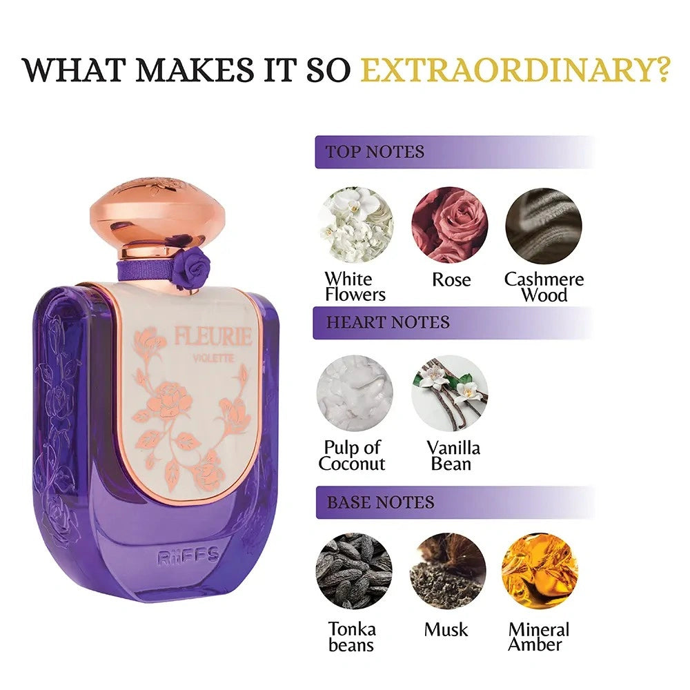 RIFFS FLEURIE VIOLETTE IS AN EXQUISITE FRAGRANCE THAT CELEBRATES FEMININITY WITH A RICH BLEND OF FLORAL, GOURMAND, AND WOODY NOTES. ITS UNIQUE COMBINATION OF WHITE FLOWERS, COCONUT, AND AMBER CREATES AN ALLURING SCENT THAT IS BOTH SOPHISTICATED AND MEMORABLE. HOUSED IN A LUXURIOUS PURPLE BOTTLE, THIS PERFUME IS DESIGNED TO CAPTURE ATTENTION AND ELEVATE YOUR PRESENCE.