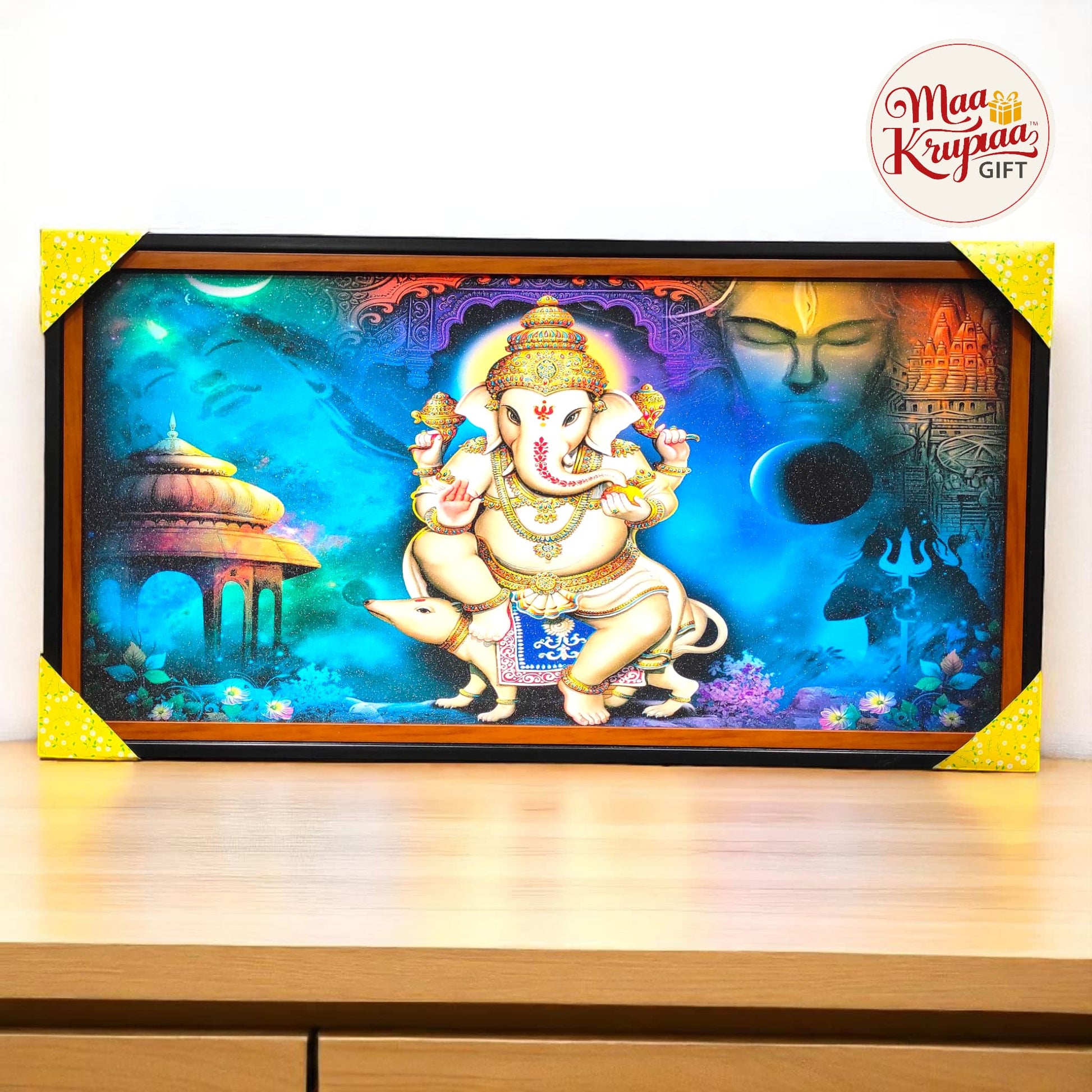 SPIRITUALLY ENRICHED GANESHA JI FRAME WITH A GALAXY AND TEMPLE BACKDROP, RIDING ON MUSHIK (MOUSE). A BLEND OF TRADITION AND COSMIC ENERGY TO BRING DIVINE PRESENCE TO ANY SPACE.