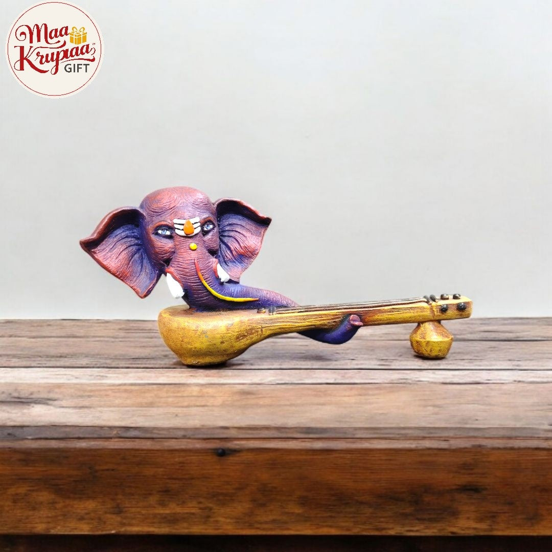 The idol is multicolored and appears to be made from a material like polyresin or fiber. It is a showpiece designed for home decoration, office desks, or as a gift. The Ganesha idol is associated with wisdom, prosperity, and musical harmony.